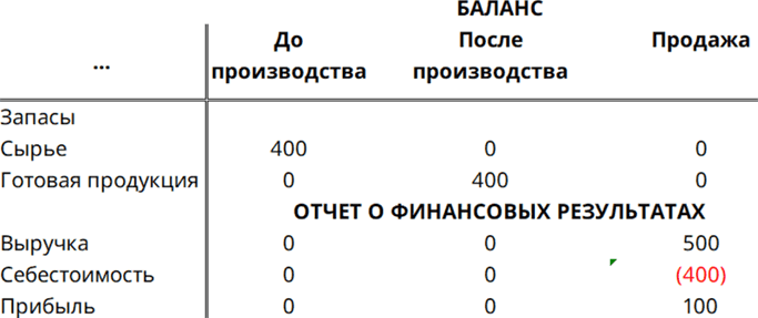В момент продажи, получаем выручку и уменьшаем ее на себестоимость, т. е. на сумму всех ингредиентов, которые были использованы для производства (снизили «Запасы»).