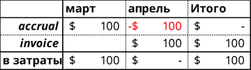 В результате, при формировании годовой или квартальной отчетности (т. е. за отчетный период), начисленные резервы (accrual) обнуляются, а в затраты попадает сумма в $100, подтвержденная документально.