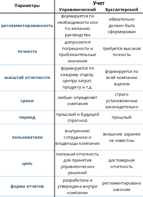 Давайте сравним бухгалтерский и управленческий учет по нескольким параметрам