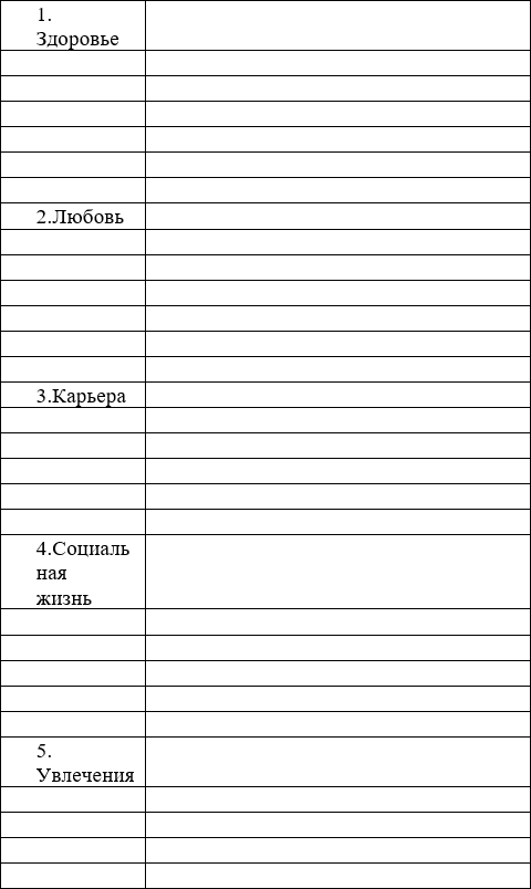 Марк ТвенЗаданиеА теперь напишите 10–15 рисков, которые, как вам кажется, могут случиться и повлиять на вашу привычную жизнь. Пишите все возможные «страхи», разделив их по пяти основным направлениям колеса баланса: здоровье, любовь, карьера, социальная жизнь, увлечения.