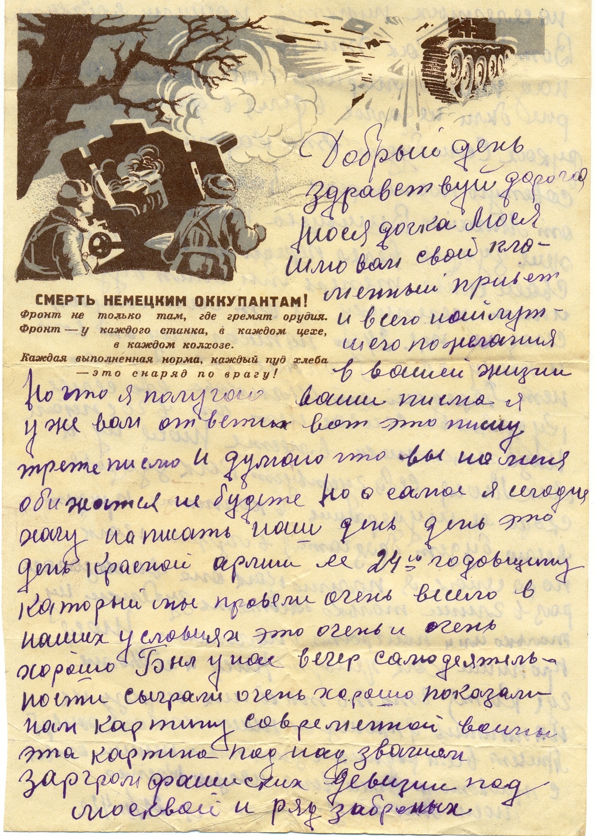 Но что я получаю ваши письма я уже вам ответ… вот это пишу трете писмо и думая что вы на меня обижатся не будете. Но а самое я сегодня хочу написать наш день день это день красной армии ее 24-ю годовщину каторый мы провели очень весело в наших условиях это очень и очень хорошо Был у нас вечер самодеятельности сыграли очень хорошо показали нам картину современной войны эта картина под названием заргром фашиских девизий под москвой и ряд забраных на селенных пунктов нашими войсками