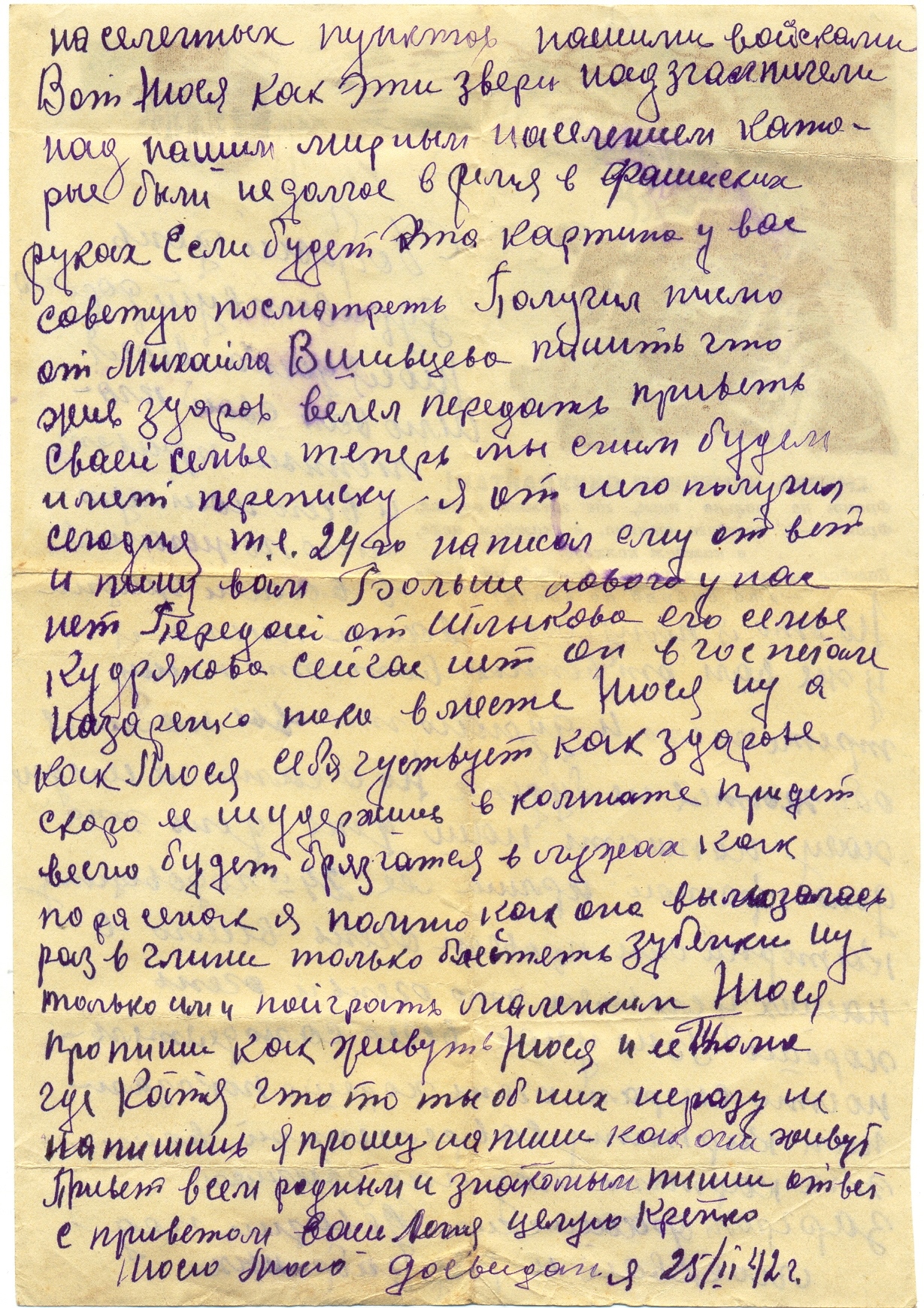 Вот Нюся как эти звери над згалничели над нашим мирным населением которые были недолгое время в фашистских руках Если будет эта картина у вас советую посмотреть Получил писмо от Михайла Вшивцева пишить что жив здоров велел передать приветь своей семье теперь мы сним будем имет переписку Я от него получил сегодня т.е 24 го написал ему ответ и пишу вам Больше нового у нас нет Передай от Шлыкова его семье Кудрякова сейчас нет он в госпитале Назаренко пока в месте Нюся ну а как Люся себя чуствует как здорове скоро ее неудержишь в комнате придет весна будет брязгатся в лужах как порасенок я помню как она вымозалась раз в глине только блестять зубики ну только им и поиграть маленким Нюся пропиши как живут Нюся и ее Тома где Катя что то ты об них неразу не напишешь я прошу напиши как они живут Привет всем родным и знакомым пиши ответ с приветом ваш Леня целую крепко Нюсю Люсю досвиданя 25/ || 42г.