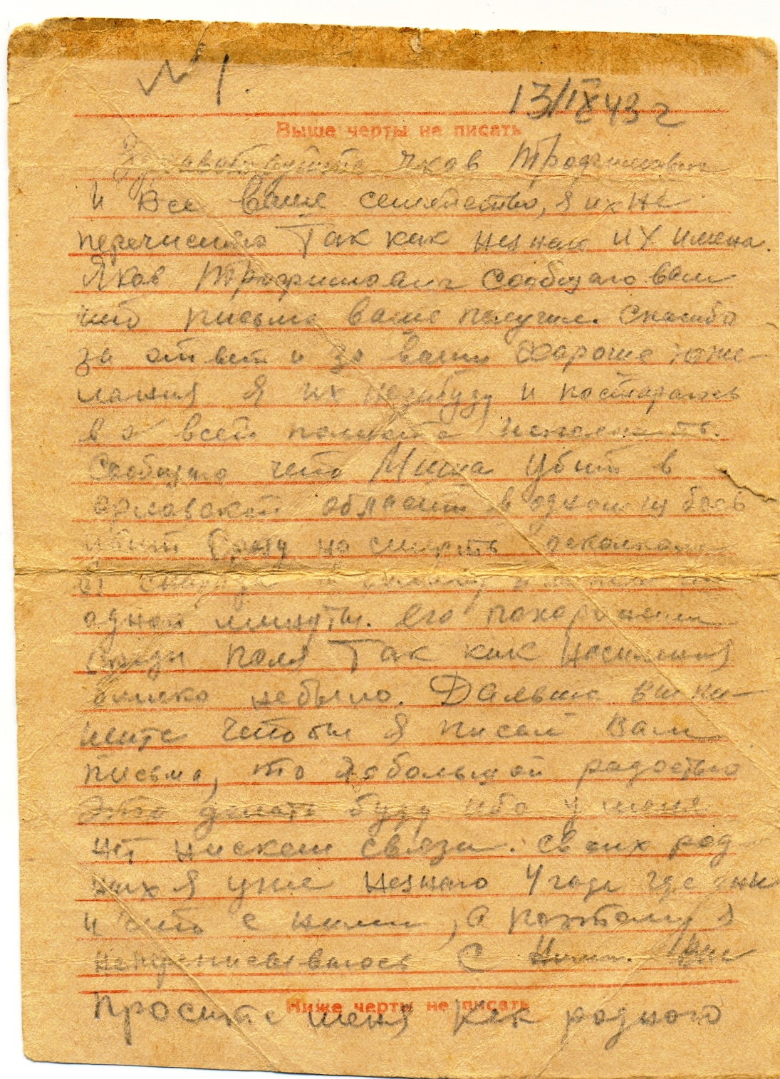 Здравствуйте Яков Трофимович и Все ваше семейство, я их не перечисляю так как не знаю их имена. Яков Трофимович сообщаю вам что письмо ваше получил. Спасибо за ответ и за ваше хороше пожелания Я их не забуду и постараюсь в … всей помнить… . Сообщаю что Миша убит в орловской области в одном из боев убит. Сразу насмерть осколками от снаряда… одной минуты. Его похоронили … поля так как … блиско небыло. Дальше вы пишите чтобы я писал Вам письма, то я с большой радостью это делать буду ибо у меня нет нискем связи. Своих родных я уже незнаю 4 года где они и что с ними, а потому я непереписываюсь с ними. Вы просите меня как родного