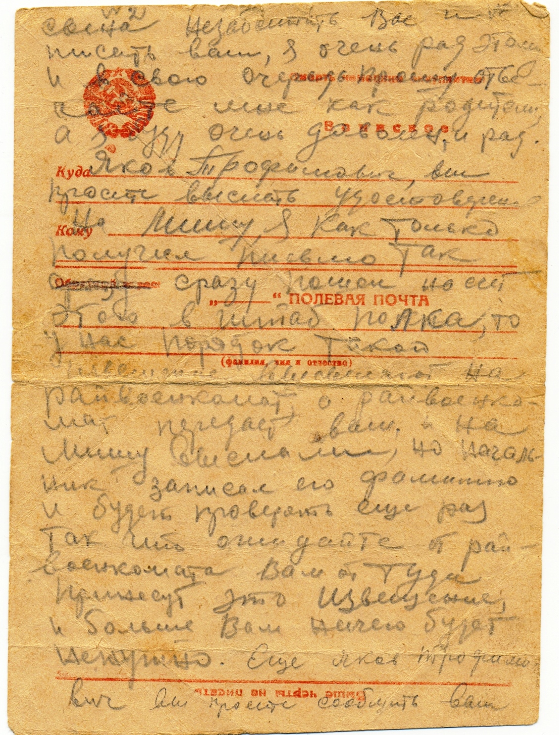 Яков Трофимович, вы просите выслать удостоверение на Мишу, я как только получил письмо так сразу послал на счет этого в штаб полка, то у нас порядок такой … на райвоенкомат, а райвоенкомат передаст вам, и на Мишу…, но начальник записал его фамилию и будет проверять еще раз так что ожидайте от райвоенкомата Вам оттуда принесут это извещение и больше Вам ничего будет ненужно. Еще Яков Трофимович вы просите сообщать вам