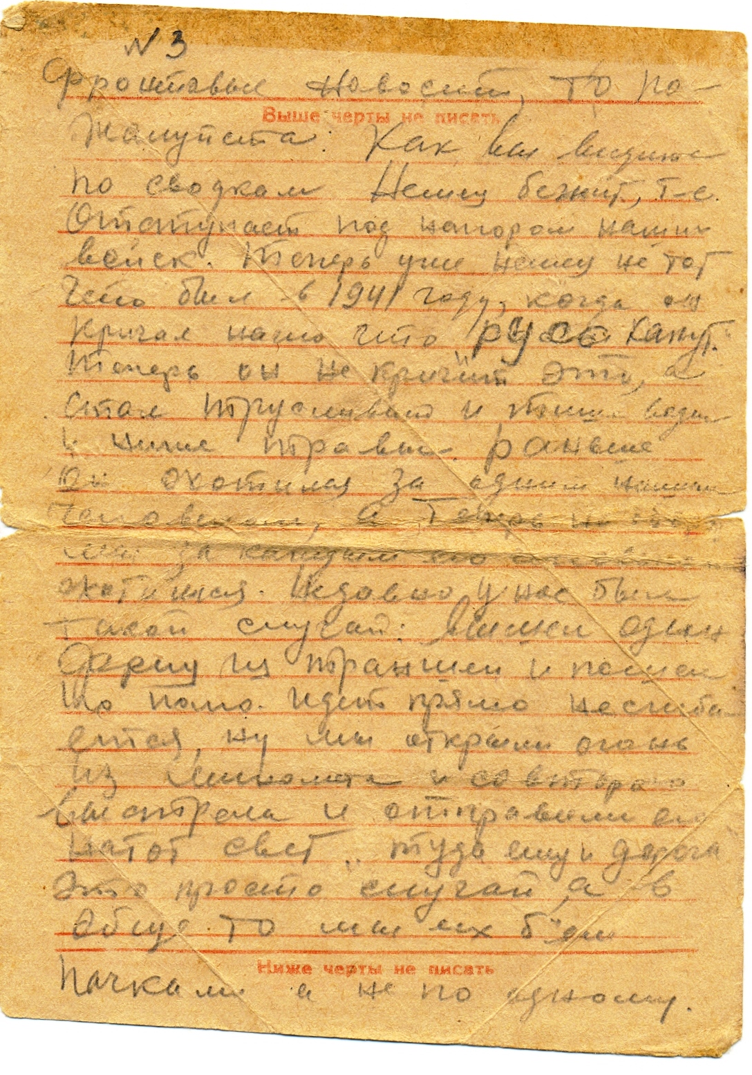 фронтовые новости, то пожалуйста: Как вы видите по сводкам немец бежит, т.е. отступает под напором наших войск. Теперь уже немец не тот что был в 1941 году, когда он кричал нам что русс капут. Теперь он не кричит это, а стал трусливый и тише воды и ниже травы. раньше он охотился за одним нашим человеком, а теперь … охотится. Недавно у нас был такой случай: Вышел один фриц из траншеи и пошел по полю. Идет прямо несгибается, ну мы открыли огонь из миномета и со второго выстрела и отправили его на тот свет, туда ему и дорога. Это просто случай, а вообще то мы их бьем пачками и не по одному.