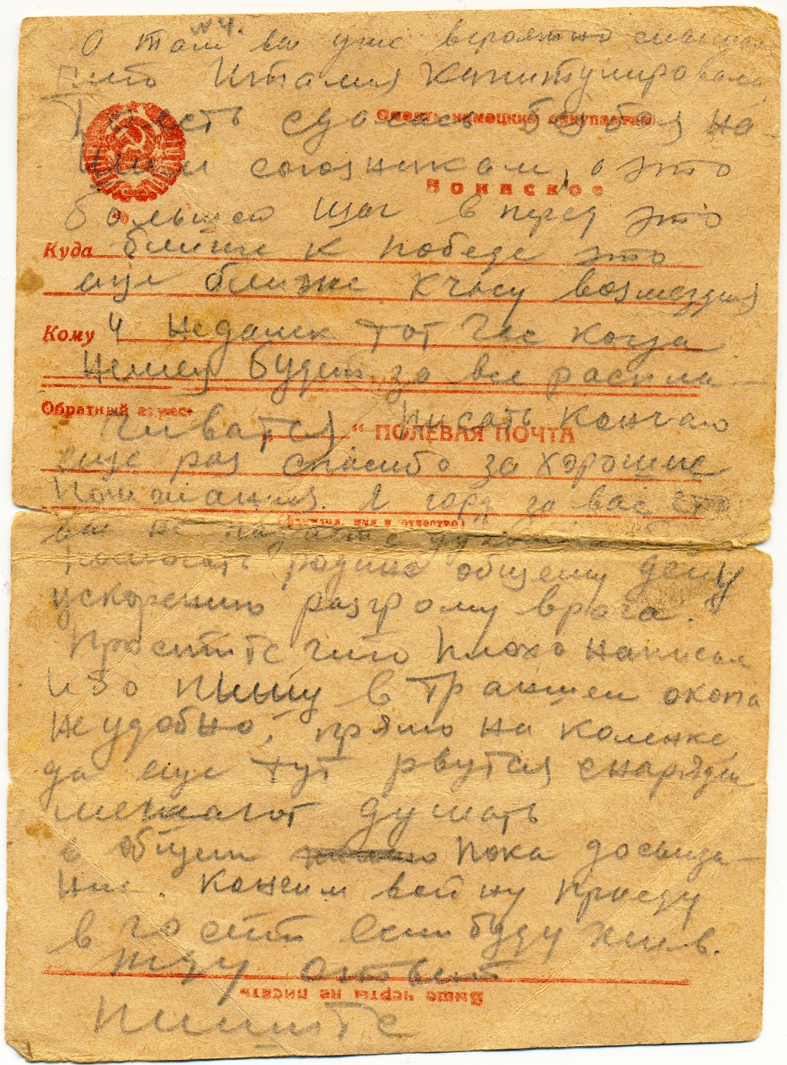 О том вы уже вероятно слышали … Италия капитулировала То есть сдалась без боя нашим союзникам, а это большой шаг вперед это ближе к победе это еще ближе к часу возмездия и недалек тот час когда немец будет за все расплачиватся. Писать кончаю и еще раз спасибо за хорошие пожелания. Я горд за вас что вы не … родине общему делу ускорению разгрому врага. Простите что плохо написал ибо пишу в траншеи окопа не удобно, прямо на коленке, да еще тут рвутся снаряды мешают думать в общем пока до свидания. Кончим войну приеду в гости если буду жив. Жду ответ