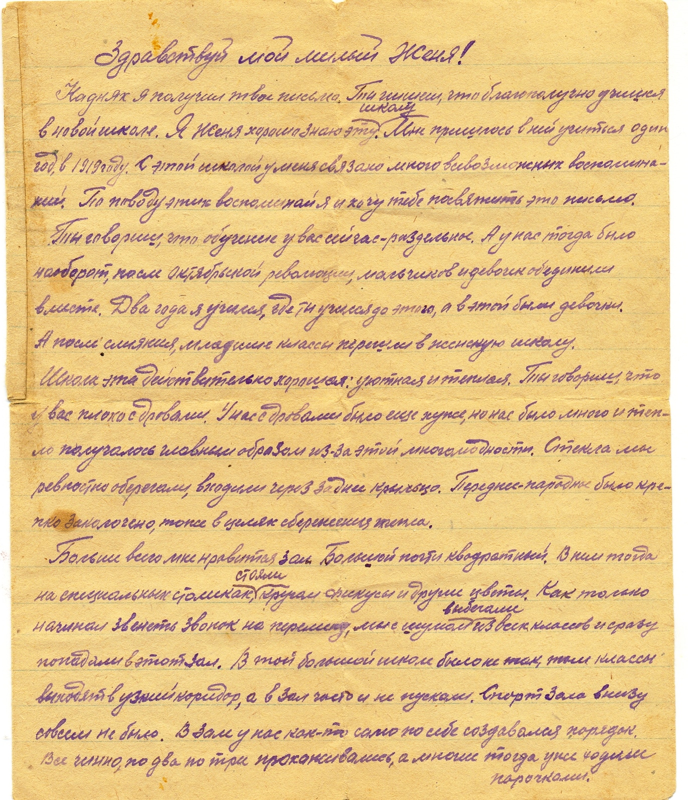 Наднях я получил твоё письмо. Ты пишеш, что благополучно учишся в новой школе. Я Женя хорошо знаю эту школу. Мне пришлось в ней учиться один год, в 1919 году. С этой школой у меня связано много всевозможных воспоминаний. По поводу этих воспоминай я и хочу тебе посвятить это письмо.