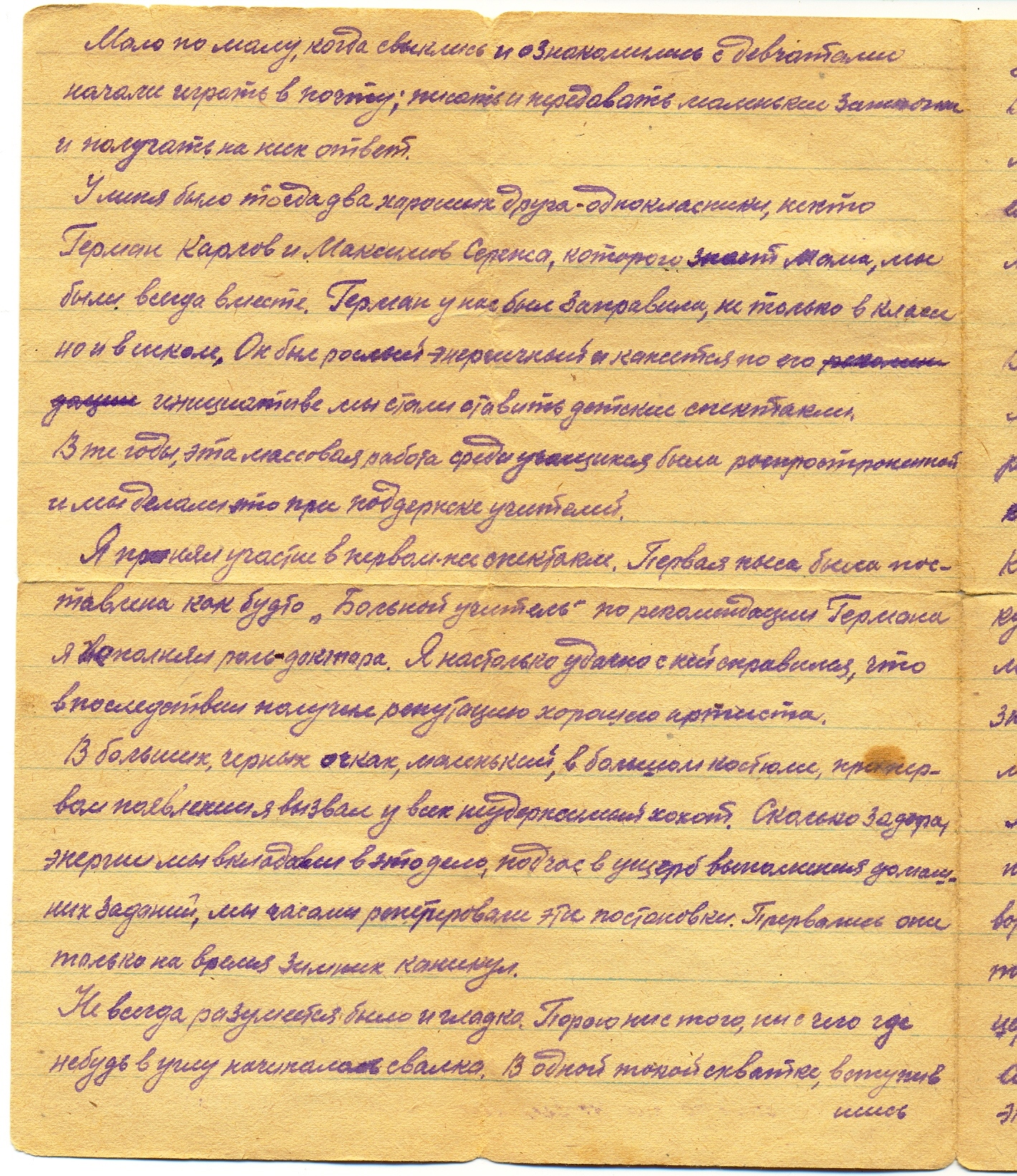 У меня было тогда два хороших друга-одноклассники, некто Герман Карлов и Максимов Сережа, которого знает мама, мы были всегда вместе. Герман у нас был заправила, не только в классе, но и в школе. Он был рослый энергичный и кажется по его инициативе мы стали ставить детские спектакли.