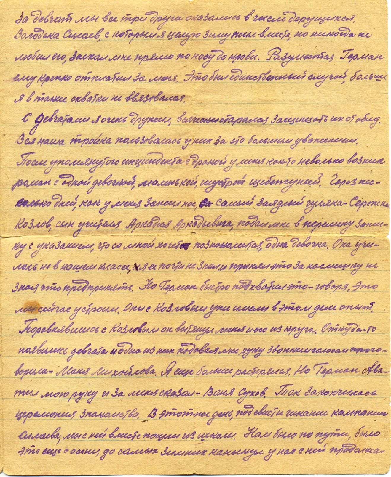 С девчатами я очень дружил всячески старался защищать их от обид. Вся наша тройка пользовалась у них за это большим уважением. После упомянутого инцидента с дракой у меня как-то невольно возник роман с одной девочкой, маленькой, шустрой щебечуньей. Через несколько дней, как у меня зажил нос, самый заядлый гуляка – Сережка Козлов, сын учителя Аркадия Аркадьевича, подал мне в перемену записку с указанием, что со мной хочет познакомится, одна девочка. Она училась не в нашем классе, я её почти не знал и принял это за насмешку не зная что предпринять. Но Герман быстро подхватил это – говоря «Это мы сейчас устроим. Они с Козловым уже имели в этом деле опыт. Поравнявшись с Козловым он вытянул меня и его из круга. Откуда-то появились девчата и одна из них подавая мне руку звонким голосом проговорила – Маня Михайлова. Я еще больше растерялся. Но Герман схватил мою руку и за меня сказал – Ваня Сухов. Так закончилась церемония знакомства. В этот же день под свист и гикание кампании Силаева, мы с ней вместе пошли из школы. Нам было по пути, было это еще с осени, до самых зимних каникул у нас с ней продолжалась хорошая дружба. А когда я приехал с каникул узнал, что она вместе с родителями уехала в другой город.