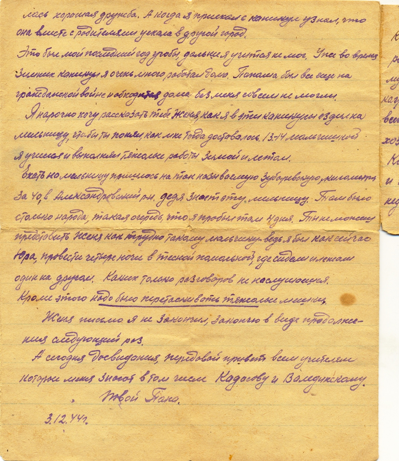 Ехать на мельницу пришлось на так называемую Зубаревскую, километров за 40, в Александровский р-н. дедя знает эту мельницу. Там было столько народа, такая очередь, что я пробыл там 4 дня. Ты неможеш представить Женя как трудно такому мальчику-ведь я был как сейчас Юра, провести 4 ночи в тесной (…), где сидели и лежали один на другом. Каких только разговоров не наслушался. Кроме этого надо было перетаскивать тяжелые мешки.