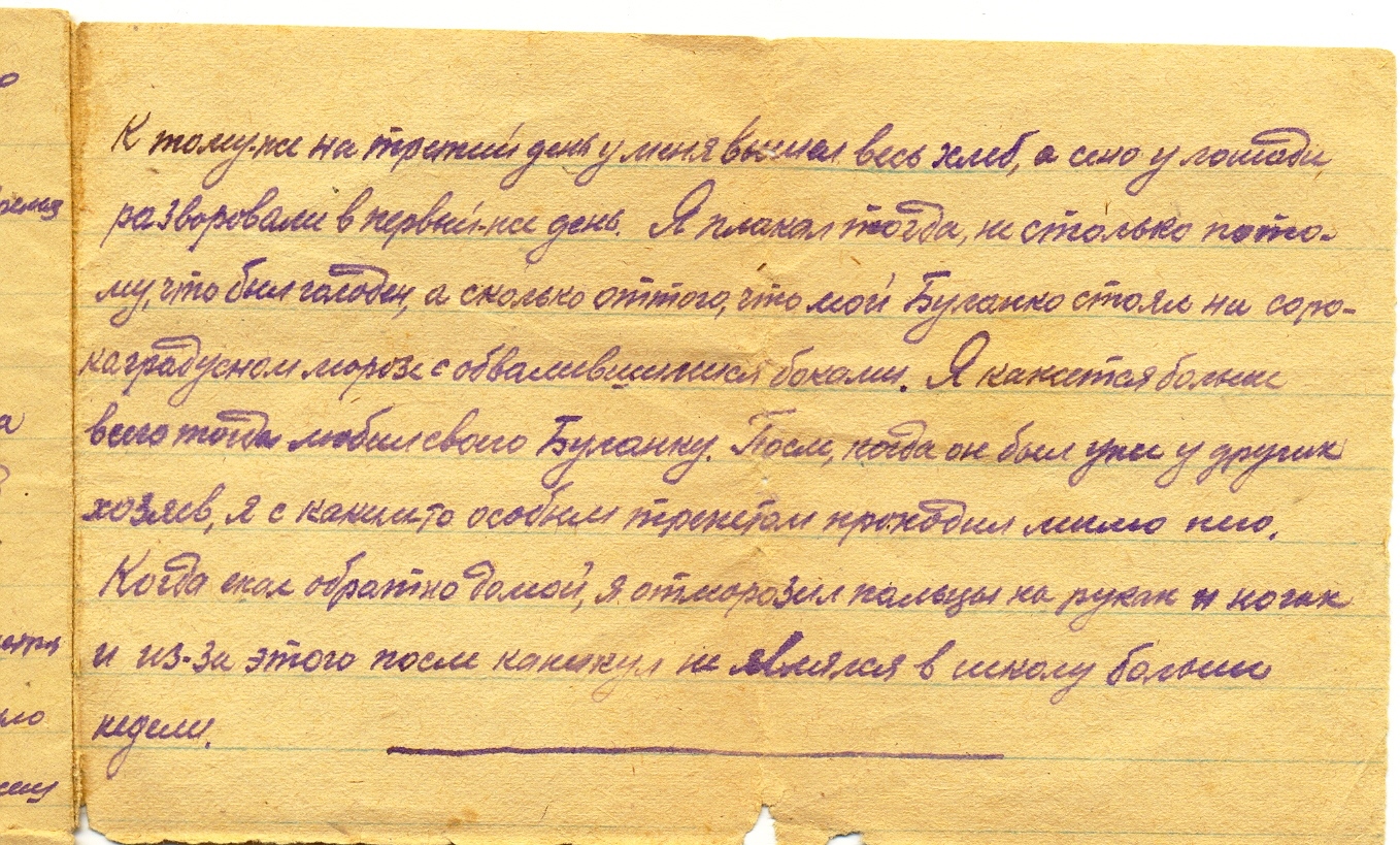 К тому-же на третий день у меня вышел весь хлеб, а сено у лошади разворовали в первый день. Я плакал тогда, не столько потому, что был голоден, а сколько оттого, что мой Буланко стоял на сорокаградусном морозе с обвалившимися боками. Я кажется больше всего тогда любил своего Буланку. После, когда он был у других хозяев, я с каким-то особым трепетом проходил мимо него. Когда ехал обратно домой, я отморозил пальцы на руках и ногах и из-за этого после каникул не являлся в школу больше недели.