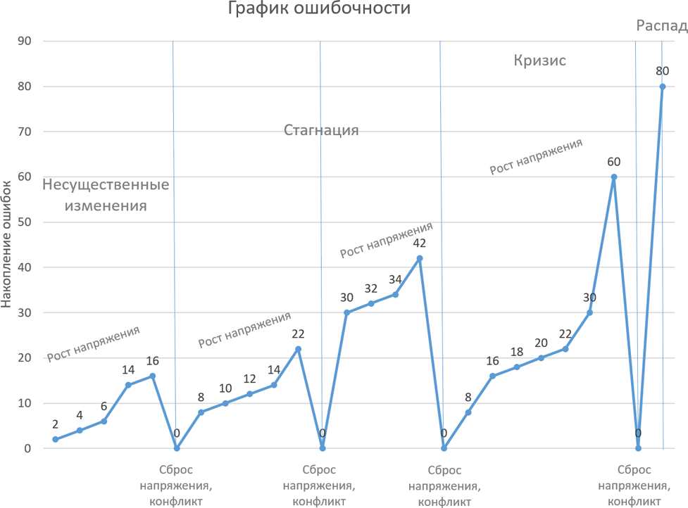 В затяжной фазе глубина отношений велика, а потребность существенно ниже, чем в начальной, соответственно, вес ошибок больше среднего, но самих этих ошибок гораздо меньше, т. е. совокупная десинхронизация по понятным причинам в затяжной фазе меньше, пределы прочности очень большие, и, чтобы такие отношения разрушить, необходимо допустить очень много ошибок.