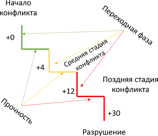 Ситуационная прочность – это способность отношений выдерживать вес ситуационных ошибок до перехода на более жёсткие инструменты воздействия, в более простой форме это можно назвать «терпение», когда это самое терпение начинает рушиться, происходит переход на более жёсткое воздействие на объект, и так по порогам (вспоминайте про когнитивные искажения собственной ценности), при уменьшении прочности порога происходит переход на другую фазу, при этом увеличивается ситуационный вес ошибки, и, если не прекратить конфликт вовремя, вступает в ход фаза разрушения, в которой вес ошибки может быть критичным, но чаще бывает тяжёлым, поэтому так важно уметь распознавать конфликт ещё на ранней его стадии и там же его прекращать, а также необходимо стараться расширять границы прочности, так как это один из необходимых инструментов для защиты ваших отношений от разрушения.