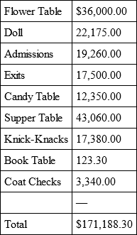 "Each of the twelve lady patronesses has promised to be responsible for the sale of a hundred tickets of admission at ten dollars apiece – that makes twelve thousand dollars in admissions. It will cost each person ten dollars more to get out, which, if only half of the tickets are used, will be six thousand dollars – or eighteen thousand dollars in entrance and exit fees alone."