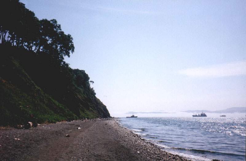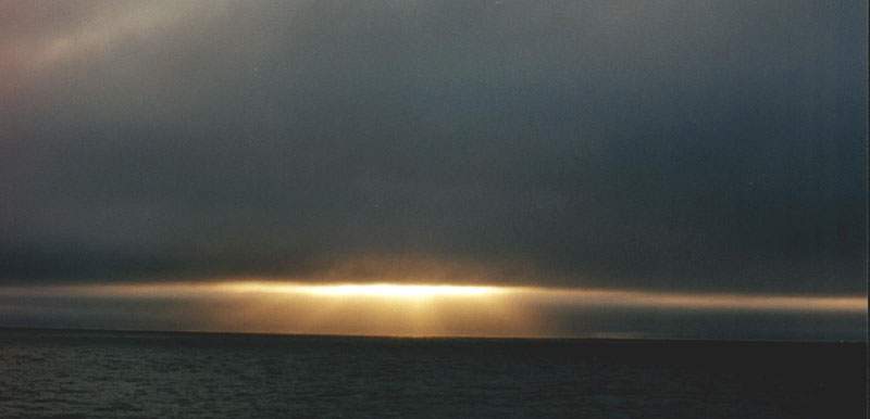 Пролив Лаперуза, видимо, проходили ночью. С утра под звуки гимна долго не хотелось вставать, так бы и лежал под тёплым одеялом. Лишь взгляд за окно заставил мгновенно меня вскочить – прямо из моря вырастали громады, которые я сначала резонно принял за скалы – тяжелые, черные, с подсвеченными верхушками. Только потом осознал, что неоткуда тут им взяться, что это темно-свинцовые тучи – прямо из воды, недалеко от борта, казалось, еще чуть-чуть, и мы врежемся в эту махину. Видимо, врезались, ничего особенного не произошло, только небо быстро затянуло серостью, спрятав восходящее солнце.