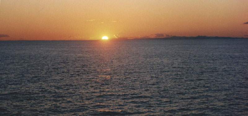 Неимоверно красивый сегодня закат – небо чистое-чистое, море, казалось, «окрасилось багрянцем», солнце прямо на глазах проваливалось за едва заметную на горизонте землю – вот уже и Приморье. Редкие облачка, словно волшебные замки, дирижаблями парили над горами, совсем неотличимые от них.