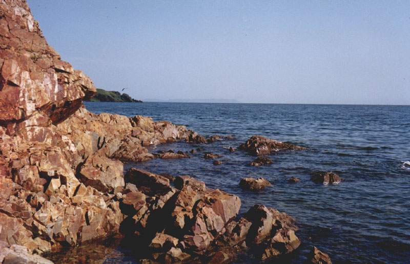 Оставшееся время я посвятил изучению окрестностей. Вдоль берега можно пройти очень далеко, перепрыгивая с одного камня на другой. В глубине зеленеют водоросли, тут и там лежат, раскинув руки-щупальца морские звёзды, чернеют колючками морские ежи. Скалы из красноватого камня, местами поросшие светло-зеленым папоротником, очень красиво сочетались с синим небом и изумрудным морем. Местами из скал текли ручейки, но они были столь малы, что пить из них было невозможно, зато этой воды вдоволь хватало паучкам, которые с большим удовольствием сплетали серебряные паутинки вокруг.