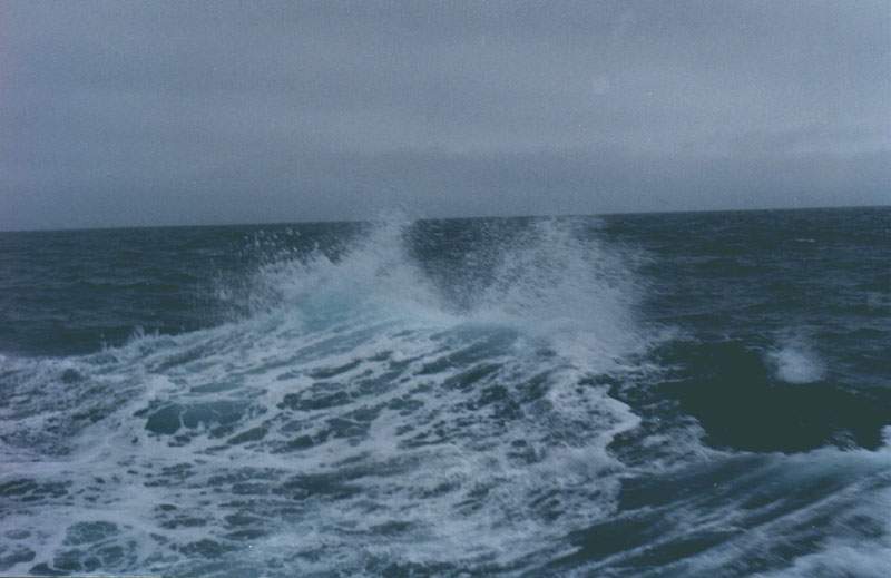 Хочется сфотографировать пейзаж, вот только сели батарейки, и фотоаппарат отказался работать. Пока достаю смену со дна рюкзака, вся картинка тает среди темно-свинцовых облаков. Раз не удалось тут, иду на бак (носовую часть корабля) – вот где явно чувствуется наша скорость! Огромные по земным меркам валы несутся навстречу, разбиваясь о нос корабля. Все это бурлит и клокочет, создавая в беспорядочном движении невероятные по красоте картины. Дух захватывает, особенно когда видишь эти валы, проносящимися на расстоянии одного-двух метров от себя, или когда пытаешься представить себе, каково оказаться сейчас за бортом. А ведь вас с ним разделяет всего несколько метров.