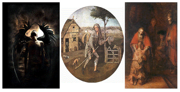 – У некоторого человека было два сына; и сказал младший из них отцу: отче! дай мне следующую часть имения. И отец разделил им имение. По прошествии немногих дней младший сын, собрав всё, пошел в дальнюю сторону и там расточил имение свое, живя распутно. Когда же он прожил всё, настал великий голод в той стране, и он начал нуждаться; и пошел, пристал к одному из жителей страны той, а тот послал его на поля свои пасти свиней; и он рад был наполнить чрево свое рожками, которые ели свиньи, но никто не давал ему. Придя же в себя, сказал: сколько наемников у отца моего избыточествуют хлебом, а я умираю от голода; встану, пойду к отцу моему и скажу ему: отче! я согрешил против неба и пред тобою и уже недостоин называться сыном твоим; прими меня в число наемников твоих…