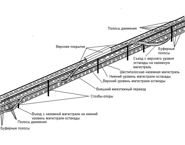 Магистраль-эстакада может быть надземной частью загруженной значительную часть суток городской магистрали, а также и надземной частью перегруженной междугородней магистрали. Например, в случае установки над наземной магистралью восьмиполосной магистрали-эстакады, на ее первый или второй этаж легковые автомобили с наземной магистрали проезжают по боковому отводу-въезду (на этом участке магистрали, во избежание торможения основного транспортного потока, перед въездом формируется буферная полоса), а также могут въезжать на второй этаж с первого этажа по межэтажному переезду. С второго этажа магистрали-эстакады легковые автомобили, проехав свою часть пути, могут съехать по боковому отводу-съезду на наземную магистраль непосредственно или спустившись со второго этажа на первый по межэтажному переезду, а затем с первого этажа по съезду на наземный уровень. При этих переездах, во избежание заторов, используются буферные, или резервно-технические полосы. Кроме того, на прилегающих к съезду с магистрали-эстакады участках наземной магистрали для облегчения выезда автомобилей с этажей магистрали-эстакады на полосы движения наземной магистрали по ее краю формируется буферная полоса. Распределение автомобилей при проезде осуществляется следующим образом: автомобили, въехав, например, на полосы движения первого этажа через буферную полосу магистрали-эстакады могут так и следовать по полосам движения первого этажа или, при более разреженном движении на втором этаже, следуя указателям, переехать на него.