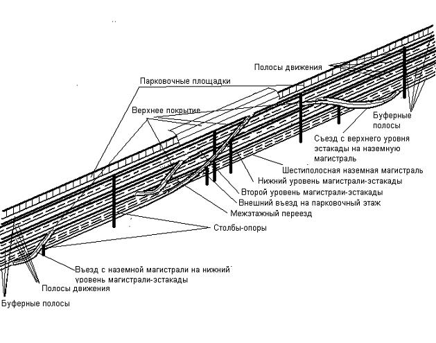 С учетом этого на стадии проектирования выбирается этажность надземной магистрали и, вместе с тем, число полос движения на ней, которое может доходить до нескольких десятков даже при не слишком большой ее высоте, например, высота пятиэтажной магистрали двустороннего движения при ее ширине в 12-ть метров составляет 17 метров (высота пятиэтажного дома), а число полос движения равно 20-ти.