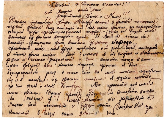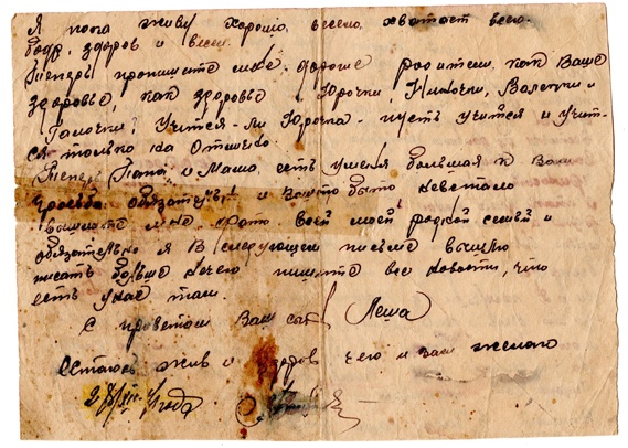 Кляня! У Вас есть много нового, но почему то мало мне об этом пишите. Пишите о работе колхоза, Роко, школ и др. Кто из товарищей ушел на фронт? Какие отметки получает Люся? Как готовитесь к новому году? Пусть Леня и Галя повеселятся вокруг елки, расскажут стихи, споют, спляшут. Хотя я, может быть не увижу, но я буду знать, что мой дети радостно встречают новый год. Живет ли у Вас Надя? Обратный адрес Кланя, в твоем письме, писал кто – то другой. Я подумал, что это почерк Нади. Верно ли это? – сообщи.