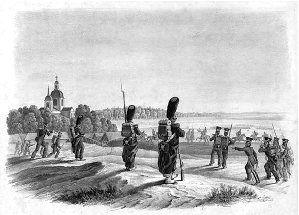 Дивизионный наш Неверовский просил графа Милорадовича, чтобы сменил дивизию его, разбитую до невозможности, сказав, что она без обуви, не имеет времени починиться, да и силами ослабела, всегда под выстрелами от Смоленска. «Знаю, ваше превосходительство, что дивизия ваша ослабела силами, но зато тверда духом!» – отвечал граф, и Неверовскому не оставалось более, как благодарить за честь, которую ему делает граф[43]. Церемония кончилась, а мы все остались в авангарде. Мы были еще в драке у реки Красной Пахры, и сия была уже для нас последняя. Подойдя к Тарутинскому лагерю, полки наши дошли до совершенного ничтожества: в нашем оставалось до 300 человек и 6 офицеров. Главнокомандующий уменьшил дивизию: из шести полков по два послал формироваться. Из нашей дивизии назначили Тарнапольский и наш 50-й егерский. Людей мы сдали в 49-й, оставив только 40 человек и полковой штаб. У нас было музыкантов с барабанщиками вдвое, чем весь полк. Наш бригадный Воейков просил меня идти к нему в адъютанты, ибо его адъютанта произвели в майоры. Я посоветовался с полковником, который мне не присоветовал, а взял с собою. Не знаешь, где найти и где потерять. Хорошо, что я не пошел к нему: он был бригадный одного полка и вскоре по болезни уехал в Петербург, и мы более о нем не слыхали: пропал без вести! По названию у нас все был полк, хотя 40 человек, но штаб был полка налицо.