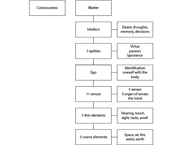 Intellect is the fundamental principle of the matter, from which the remaining elements originate. From the field of the intellect arise the ego, the subtle senses, and coarse elements.