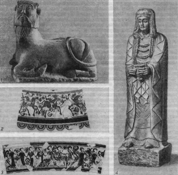 Кельтиберсков искусство: 1. Статуя быка о человеческой головой из Бала-соте. Около 4 в. до н. э. Национальный археологический музей. Мадрид. 2. Всадники. Роспись сосуда из Лирии. 2 в. до а. э. – 1 в. н. э. Археологический музей. Валенсия. 3. Танцы. Роспись сосуда из Лирии. 2 в. до н. а. – 1 в. и. э. Археологический музей. Валенсия. 4. Женская статуя из Серро-де-лос-Сантос. 2 в. до н. э. Национальный археологический музей. Мадрид. Большая советская энциклопедия, т. 20, с. 501.