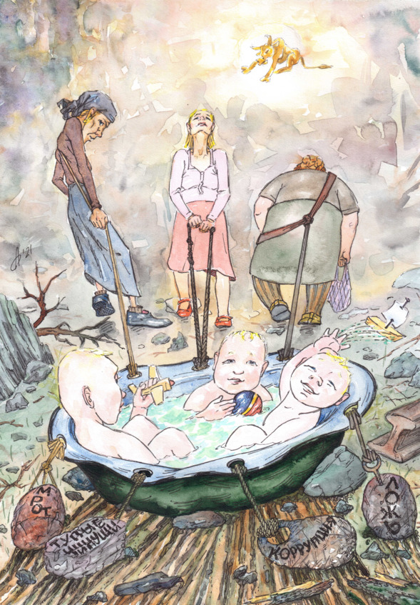 В двух метрах от острова Жора грузным кулем ухнул-таки в ледяную воду. Жук и Жига, оживленно переговариваясь, только сели на сухом берегу, как стена воды накрыла их с головой. Через мгновение, словно водяной из толщи талых вод, восстал Жора. На плечах – ветви ольшаника, спирали лягушачьей икры, с просвечивающими головастиками. В руках – скальп подводной нечисти, странно похожей на верхушку обычной кочки.
