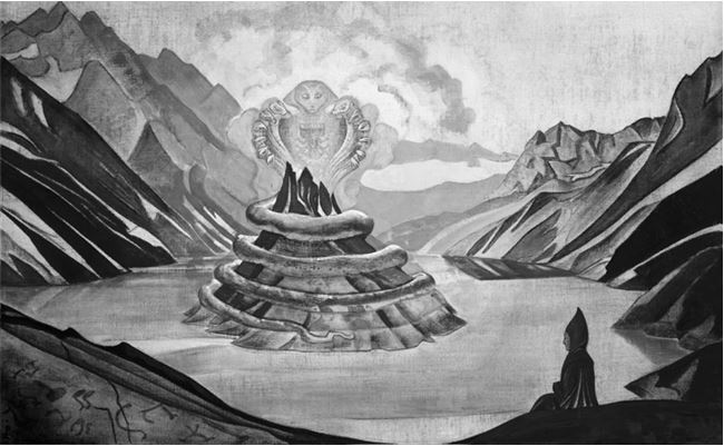«“Нагарджуна – Победитель Змия” видит знамение на озере владыки Нагов» [1, с. 99], – упоминает его Николай Константинович в своих записях в период создания картины.