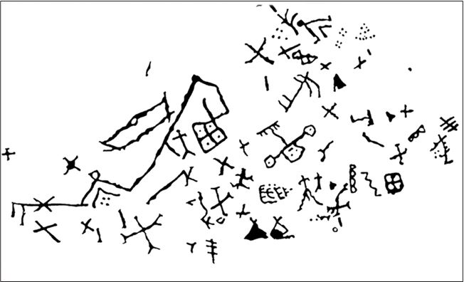 Рис. 2. Прорисовка петроглифов древнего Зодиака в гроте урочища Ак-Баур. Алтай (использован фрагмент прорисовки З.С.Самашева из его книги «Наскальные изображения Верхнего Прииртышья», Алма-Ата. 1992).
