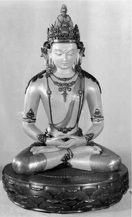 В ареале рассматриваемых северо-буддийских произведений интересным примером является использование крупного горного хрусталя в скульптуре Ваджрадхары из собрания А.М.Позднеева (рис. 7). Включение горного хрусталя в складке ленты-шарфа Вад-жрадхары противоречит принятой иконографии. Скорее всего, камень был вставлен позднее времени создания скульптуры одним из ее владельцев. Однако, даже в случае поздней вставки горный хрусталь придает скульптурному образу новую грань, выступая своеобразной буквализацией алмазной сущности Ваджрадхары, являясь особым магнитом Света.