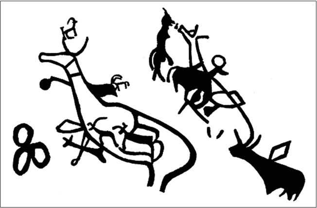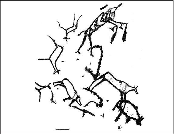 Рис. 2. Петроглифы грота Куйлю. Композиция с маралухой. Эпоха бронзы. Выбивка. 1/8 натуральной величины