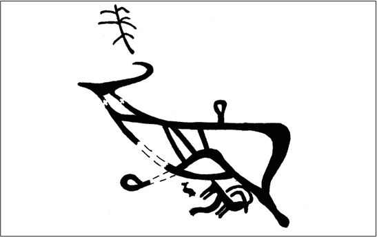 В дальнейшем нами были открыты петроглифы Черной речки, находящиеся ниже по течению Кучерлы [17]. Петроглифы располагаются на ровной вертикальной плоскости ромбовидной формы размером 1,2 × 0,8 м. Выбивка здесь неглубокая, что придает всей композиции необычную воздушность, а само сочетание белых фигур и коричневого фона – особую привлекательность среди петроглифов Алтая. Основу писаницы Черной речки составляют три крупных животных. Два из них как бы опираются на громадные полукруглые рога козла, стоящего ниже. Правое имеет большой рог необычной формы. Левое выделяется выразительностью своих очертаний. По-видимому, это синкретичное существо, в котором есть что-то и от быка, и от оленя. У него лировидные рога и пушистый хвост, как у яка. Декоративная завершенность форм, изящная обрисовка ног, стоящих как бы на пуантах, – все это близко скифо-сибирскому «звериному стилю». Однако первоначальный вид писаницы в эпоху бронзы был другим. На ней не было этого животного, а на его месте находилось несколько более мелких изображений.