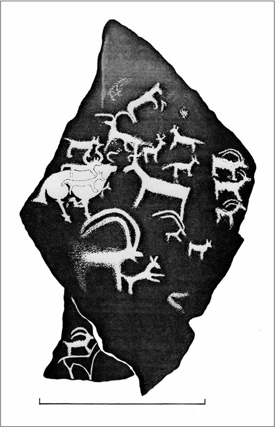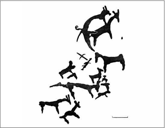 Рис. 6. Петроглифы Зеленого Озера. Плита 1. Композиция с антропоморфным существом и животными. Первая половина II тыс. до н. э. Выбивка. Шкала 10 см