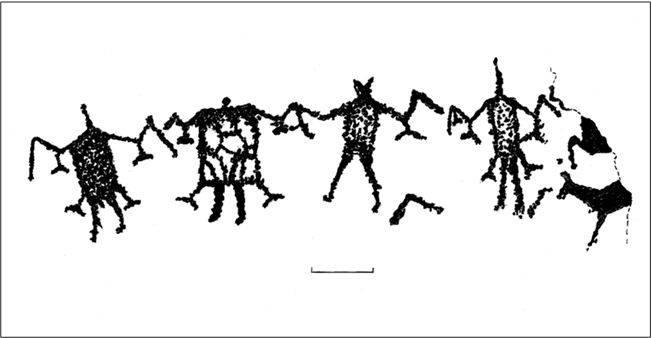 Рис. 7. Петроглифы Зеленого Озера. Плита 18. Композиция с четырьмя фигурами. Первая половина II тыс. до н. э. Выбивка. Шкала 10 см