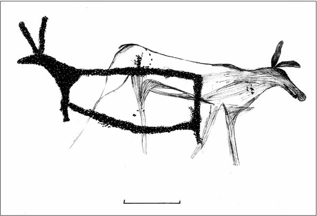 Рис. 8. Петроглифы Поперечной Красноярки. Участок 14. Лосиха и маралуха. Палимпсест. Гравировка и выбивка. Шкала 10 см