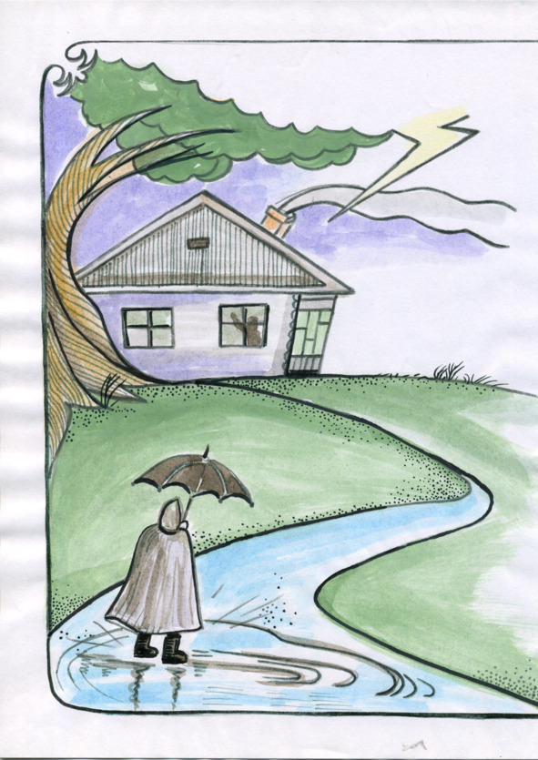 «Раз вечером разыгралась непогода; молния так и сверкала, гром гремел, а дождь лил, как из ведра; ужас что такое!»