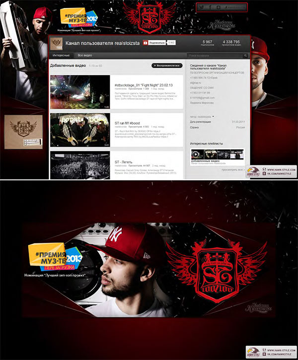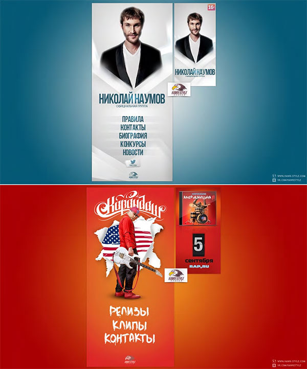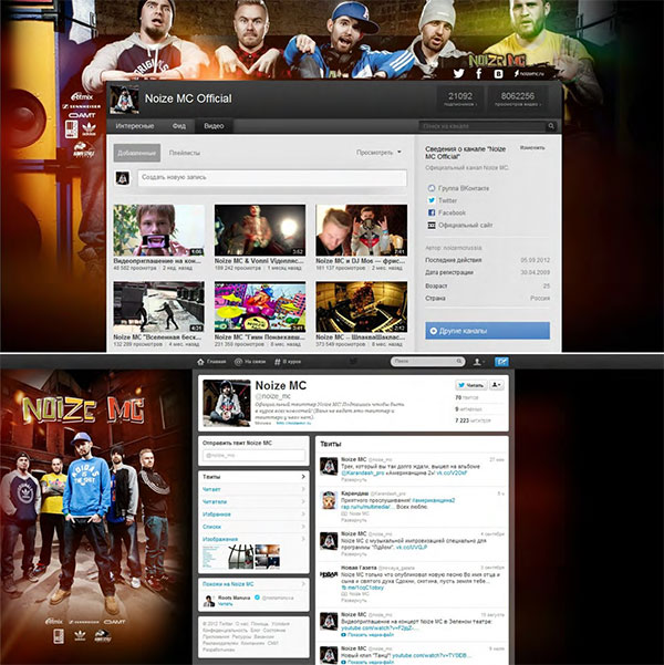 Когда я делал группы ВКонтакте на меня вышли известные люди. Если брать сферу рэп-музыки, это были: Noize MC – довольно известный (кстати тогда за дизайн соц сетей мне дали бесплатные билеты на концерт Нойза в моем городе), Карандаш, ST. Я также делал дизайн для официального сообщества Николая Наумова («Реальные пацаны»), я думаю, многие слышали, достаточно продолжительный сериал.