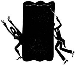 После окончания первого действия я бегу за кулисы, спускаюсь в люк и попадаю в осветительную будку к моему вернувшемуся другу, электротехнику Левке. Мы высовываемся из будки и видим, как на сцене, за закрытым занавесом, собралась вся труппа.