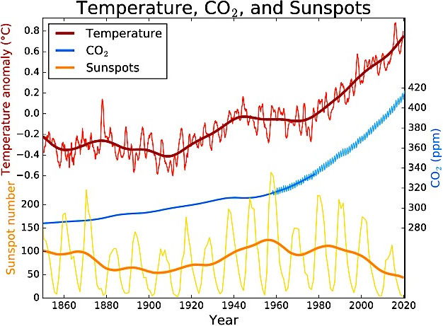 Рис. 1. Изменение средней температуры поверхности Земли (красная линия), концентрации СО2 в атмосфере (синяя линия) и солнечной активности (желтая линия) за 1860–2020 гг. (данные Всемирной метеорологической организации)