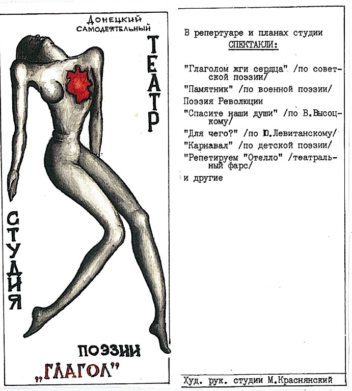В 60-х годах (это аж прошлый век!) я организовал в Донецке (Украина) самодеятельный Театр поэзии «Глагол» (это из пушкинского «Глаголом жги сердца людей»). Хотя театр наш был любительским, но всё равно все наши спектакли принимала какая-нибудь тупая парткомиссия. Она-то и выяснила очень быстро, что поэзию для инсценировок мы подбирали «неправильную». Например, в спектакле «Глаголом жги» наши актёры кричали в лицо опупевшей комиссии строки Пушкина: