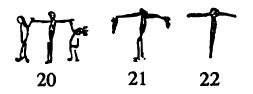 – Давай придумаем и нарисуем картинки для остальных звуков, – предложил своей дочке Тегумай. Они превосходно провели утро; в полдень закусили и вместо отдыха побегали и повозились. Когда дело дошло до звука «т», Тефи объявила, что, так как ее собственное имя, имена ее папочки и мамы начинались этим звуком, оставалось только нарисовать семейную группу: папу, маму и Тефи, держащихся за руки. Раза два можно было нацарапать такую сложную картинку, но когда пришлось то и дело рисовать три фигурки, Тефи и Тегумай стали изображать их все проще и проще, так что наконец звук «т» превратился в тонкого, длинного Тегумая с протянутыми руками, готовыми обнять Тефи и Тешумай. Посмотри на эти три картинки, моя милая, и ты отчасти поймешь, как это случилось. Вот они (20, 21, 22):