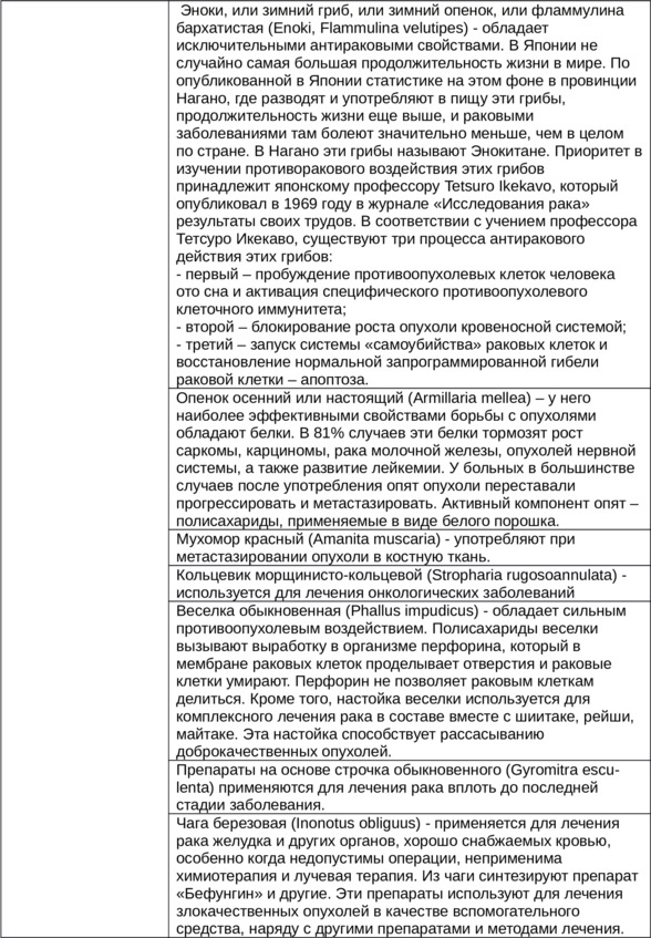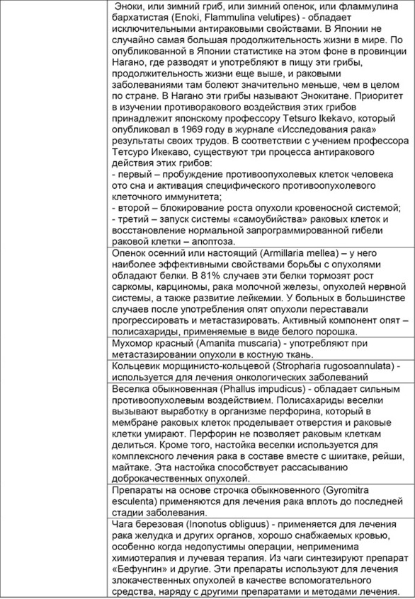 Ниже приводится сводная таблица по основным лечебным свойствам грибов (табл. 3). Следует при этом учитывать, что в тех случаях, когда используются непосредственно грибы, они не должны подвергаться термической обработке выше 70 – 80 градусов. Например, можно съесть килограммы вареных лисичек, но при этом не удастся вывести глисты и уничтожить их личинки. Если же взять чистые свежие и молодые лисички, то достаточно съесть в порезанном виде две – три штуки, чтобы достичь хорошего эффекта. Именно по этой причине применяются сушеные белые грибы – они сохраняют все лечебные свойства, но их сушка должна быть не термической, а естественной на солнце под марлей от мух. В промышленном производстве лекарств из шиитаке и других ценных грибов, также используют технологии без варки и термической обработкой выше 70 – 80 градусов.