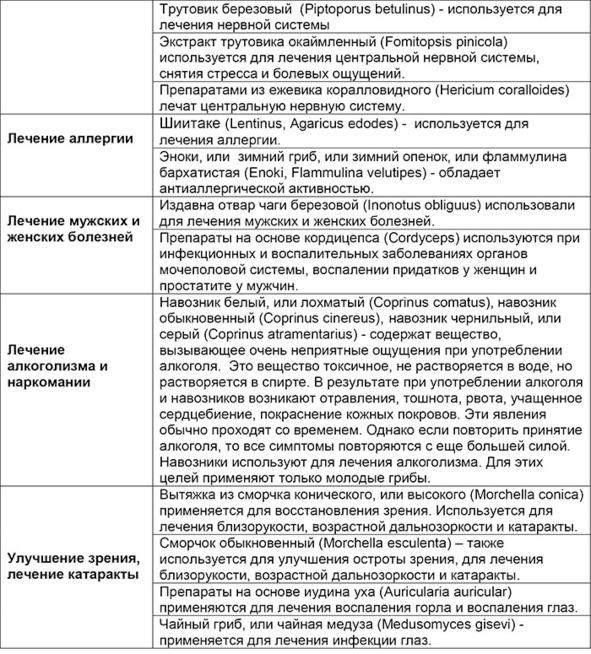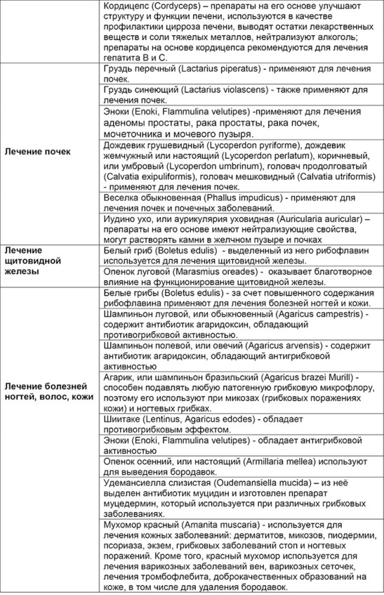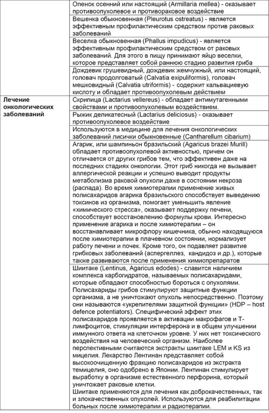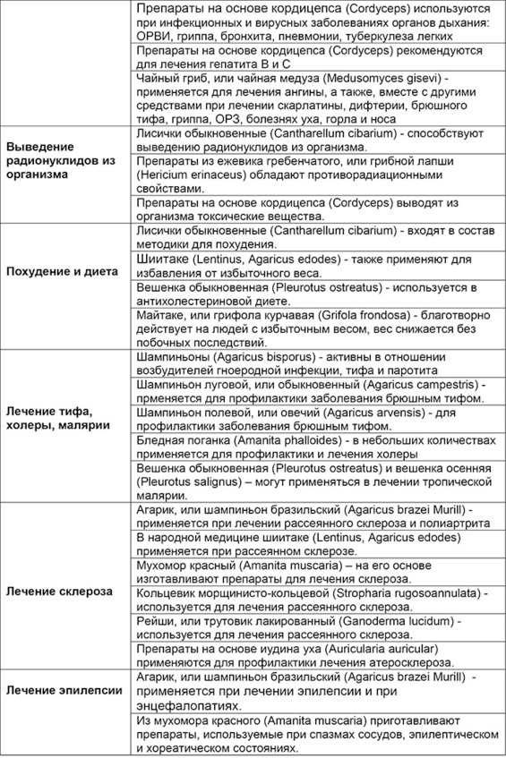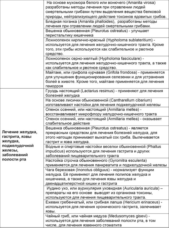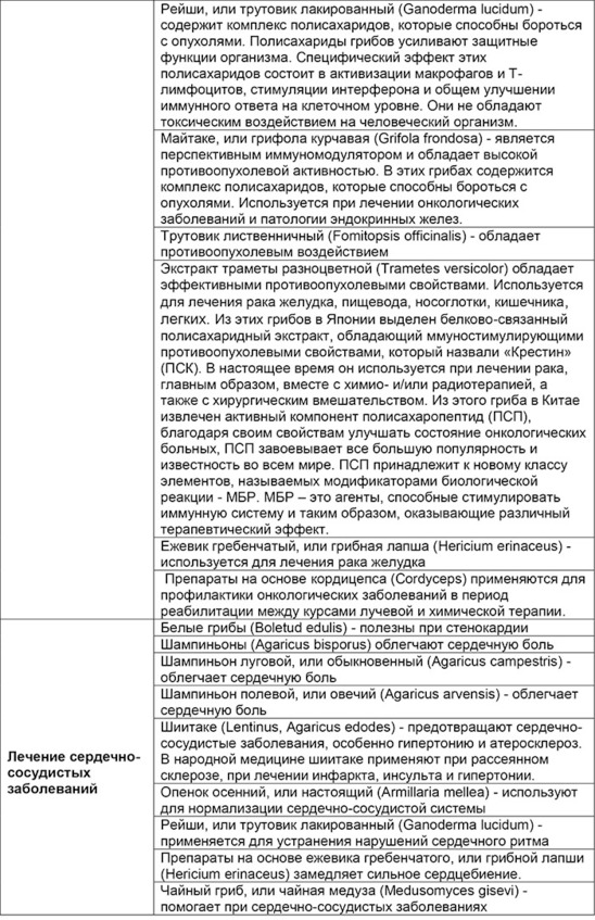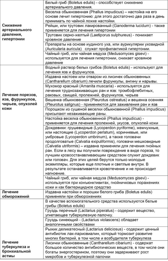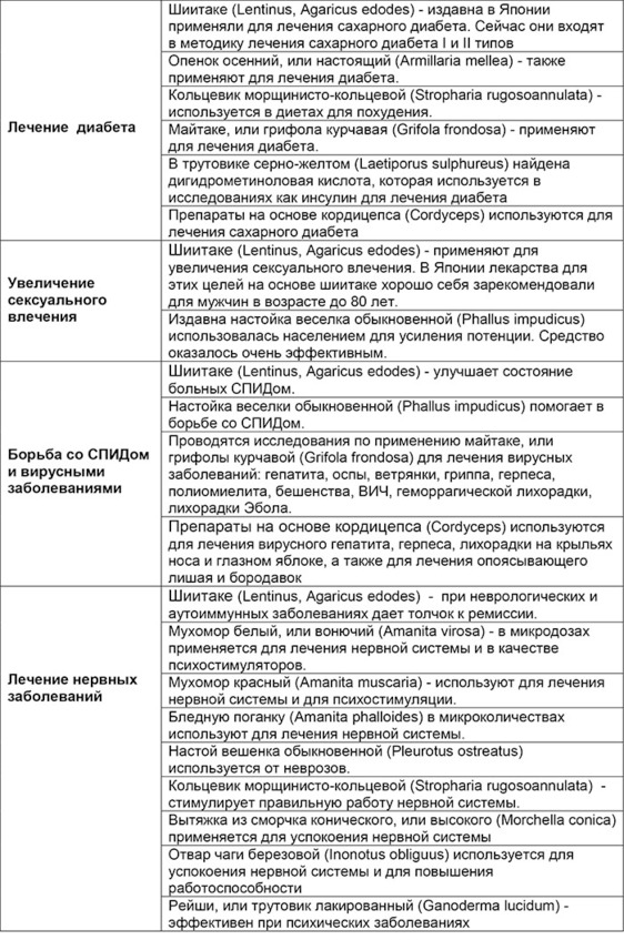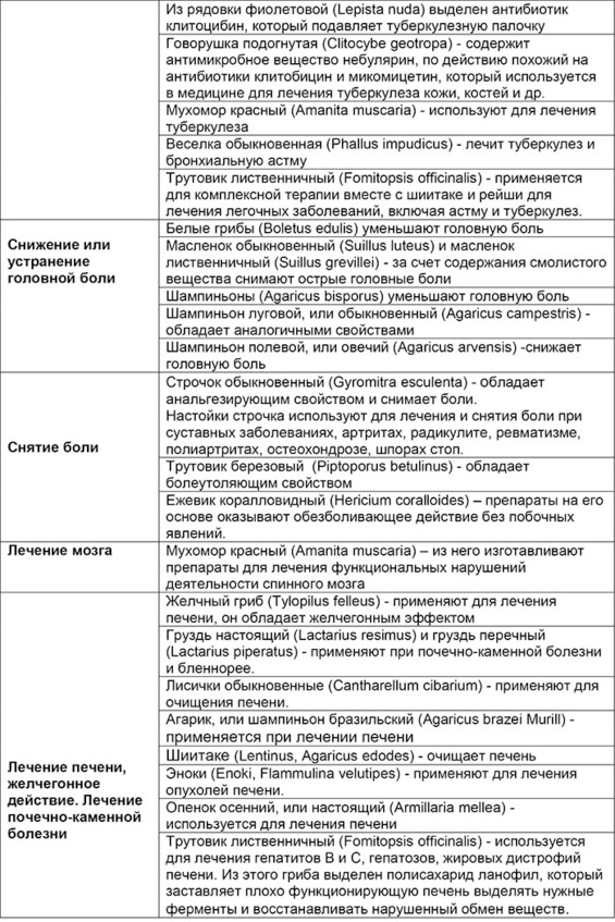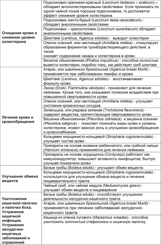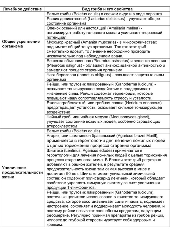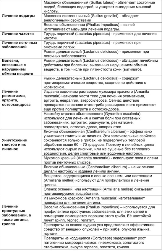 Обобщенная таблица лечебных свойств конкретных грибов