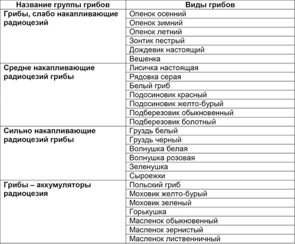 Профессор А. И. Щеглов и к. б. н. О.Б. Цветнова из лаборатории радионуклидов факультета почвоведения МГУ им. М. В. Ломоносова разделили все грибы на четыре категории по признаку накопления радионуклидов (табл. 2):
