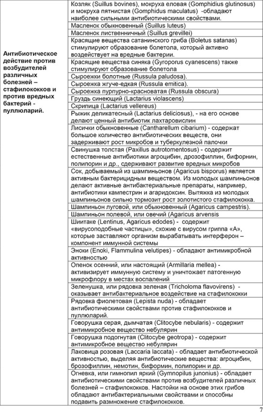– В белых грибах найдены антибиотики, которые убивают кишечные палочки и палочки Коха, вызывающие поносы. Из них делают настойку для устранения кишечной инфекции.