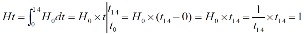 Математически здесь произведение Ht, как и раньше, является константой для наблюдаемого (!) момента (интервала) времени – t1. Величина этой безразмерной константы определяется, по существу, интегральным значением реального параметра Хаббла, изменяющегося на интервале времени от начального t0 до конечного t1. В частности, для всего времени существования Вселенной, то есть, принимая t0 = 0, t14 = 14, и современного постоянного значения параметра H0 = 1/t14, мы получим: