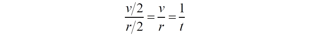 Замечаем, что эти уравнения описывают также и скорость движения каждой точки шнура, галактики. Если, например, галактика-монета находится ровно посредине шнура, то и её скорость также будет в 2 раза меньше, чем у галактики на его конце. Следовательно, уравнение будет иметь такой же вид: